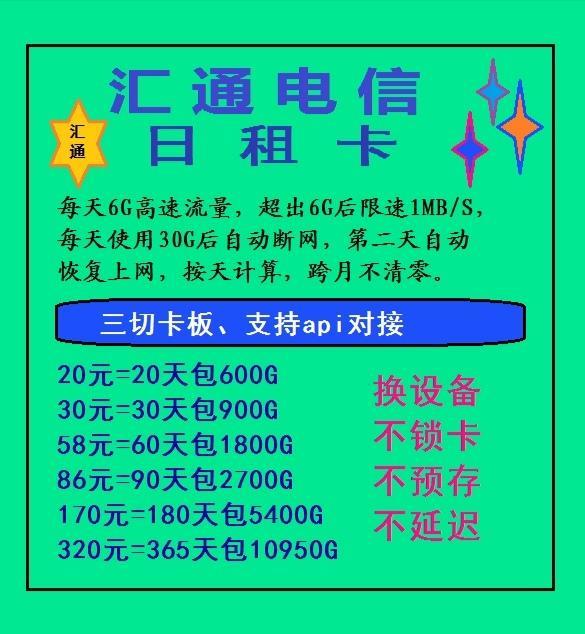 一款电信日租卡一天1元,一天30G流量,6G之后限速1MB/S,一个月30元900G。