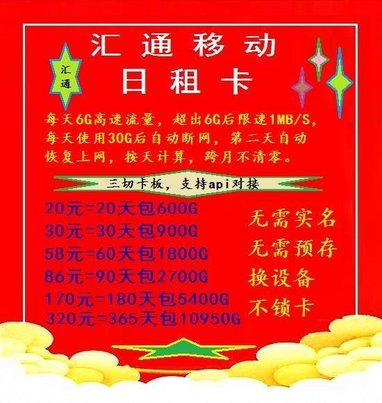 另一款移动日租卡,一天1元,一天30G流量,6g之后限速1MB/S,一个月30元900G。(移动日租卡,无需实名,插卡即用,非常方便)