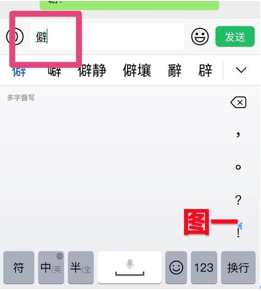 1、打开微信,随便打开一位微信朋友的聊天界面,使用手写输入法,写出要查询的字,例如僻(如图一)