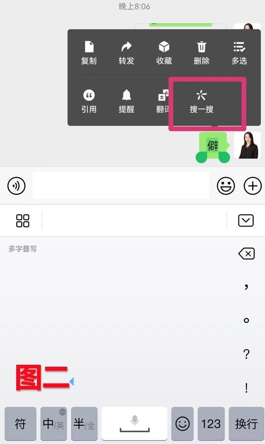 2、在文字上长按(就是按住文字3秒),在弹出来的菜单上点击【搜一搜】(如图二)