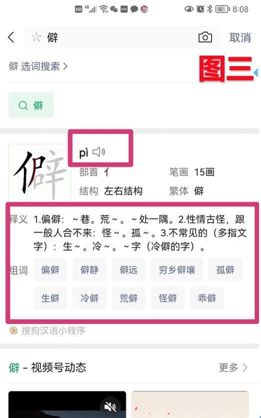 3、这样这个字的解释就出来了,如果想知道这个字怎么读,请点一下字右侧的小喇叭图标,就能听说这个字怎么读了(如图三)