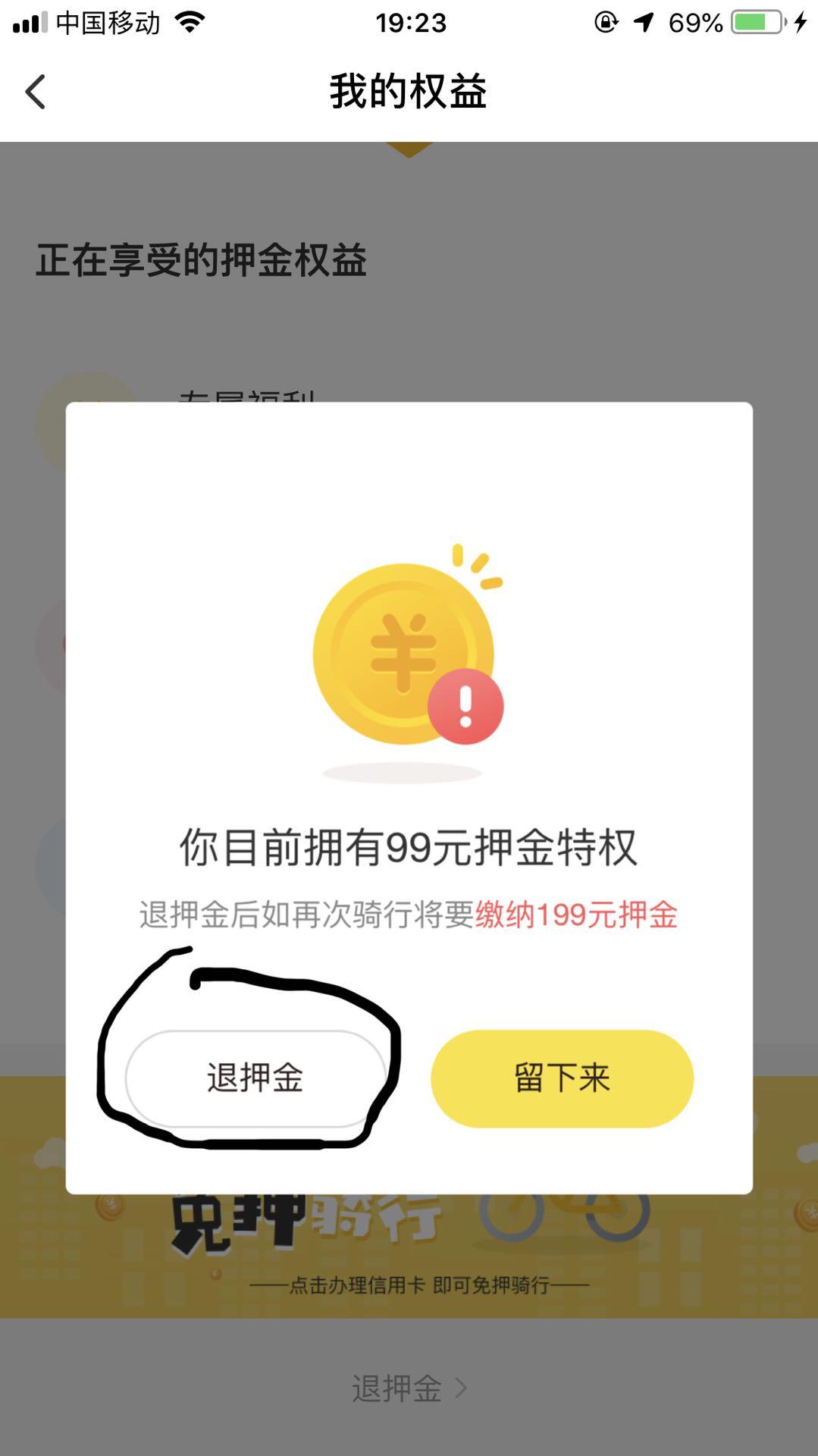 进入“我的权益”页面之后,把页面往下拉,找到最底端的“退押金”选项。