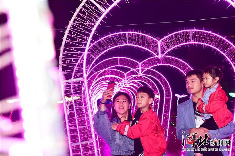 10月4日晚,正定塔元庄锦绣水上嘉年华2018璀璨灯光文化艺术节上,游客拍照留念。