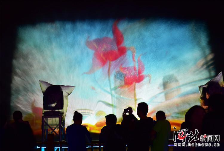10月4日晚,正定塔元庄锦绣水上嘉年华2018璀璨灯光文化艺术节上,游客正在观看水幕电影。