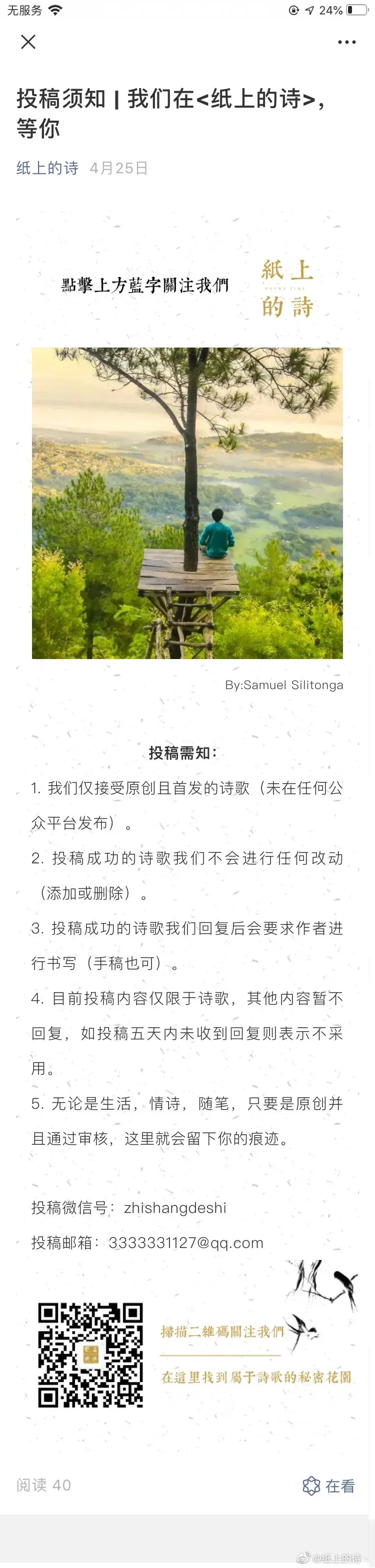 4. 目前投稿内容仅限于诗歌,其他内容暂不回复,如投稿五天内未收到回复则表示不采用。