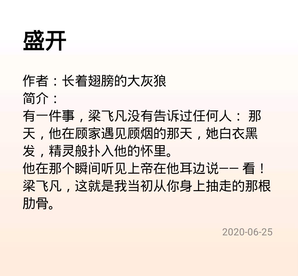 今天推荐的是挥着翅膀的大灰狼的小说《盛开》,喜欢小说的还可以搜索这个系列小说《然后,爱情随遇而安》《谁的等待,恰逢花开》……