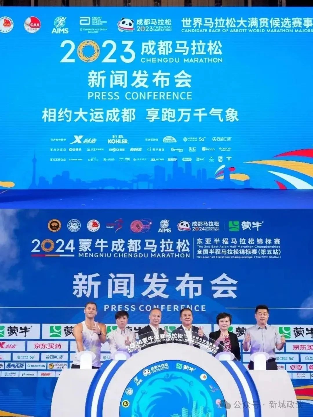 有人对比了2023年和2024年的成马新闻发布会图片,最大的变化就是成马悄然地把“世界马拉松大满贯候选赛”字样去掉了,主赞助商蒙牛的面积占了很大,把其他赞助商都压了过去,甚至出现在赛事名称上,感觉更像一个商业赛,而不是城市赛。