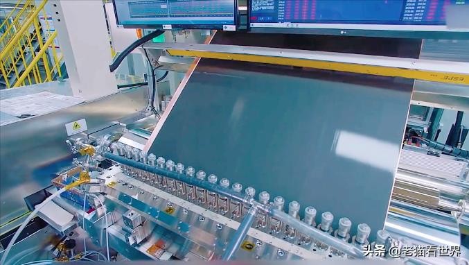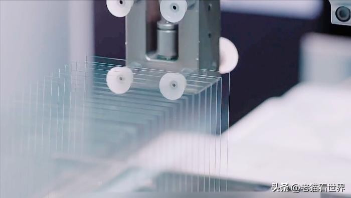 首先,自动机械臂将一组组玻璃,运送到自动化生产线车间,然后在玻璃上面涂一层叫作聚酰亚胺的特殊材料,这就是屏幕的关键点。
