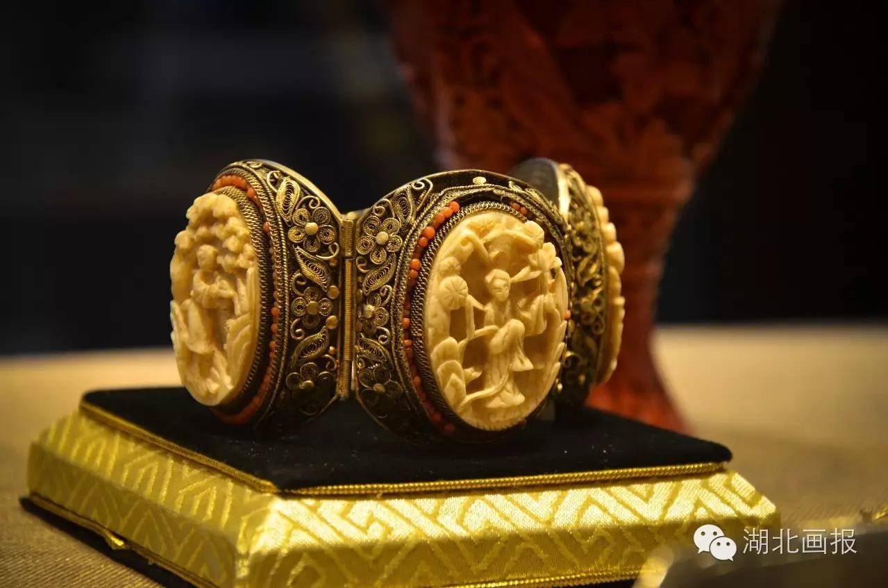 ▲清代银鎏金镶嵌象牙红珊瑚手镯,清代首饰行业分工很细,匠人分工协作,在方寸之间就可能运用到鎏金、掐丝、填丝、烧蓝、嵌宝、炸珠等数十种工艺
