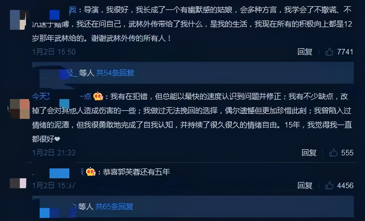 “导演,我很好,我长成了一个有幽默感的姑娘,会多种方言,我学会了不撒谎、不沉迷于赌博,我还在问自己,武林外传带给了我什么,是我的生活,我现在所有的积极向上都是12岁那年武林给的。谢谢武林外传的所有人!”
