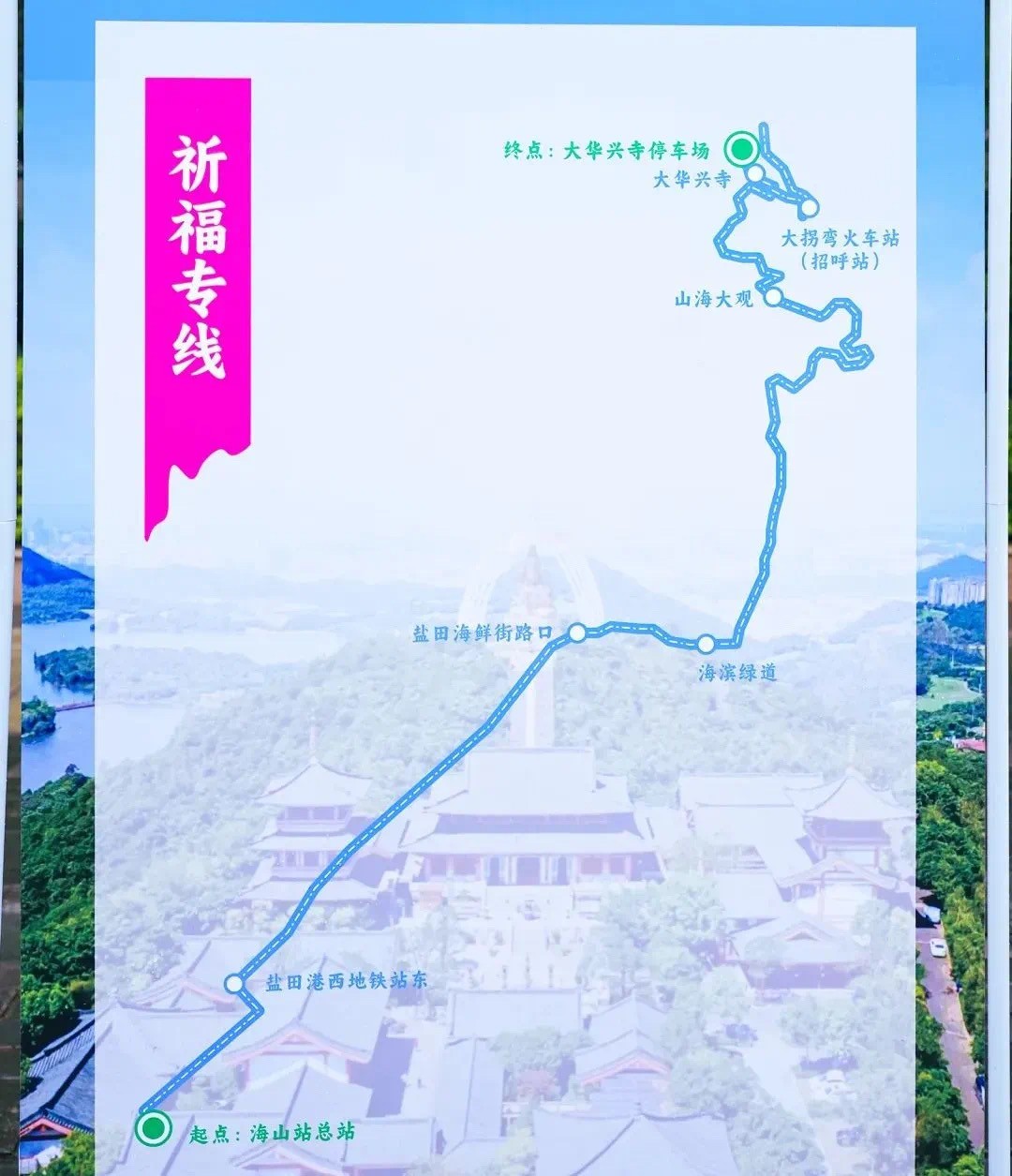 海山路总站→盐田港西地铁站东→盐田海鲜街路口②→海滨绿道→山海大观→大拐弯火车站(招呼站)→大华兴寺→大华兴寺停车场