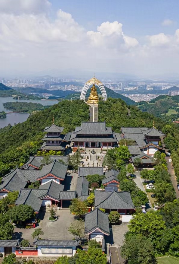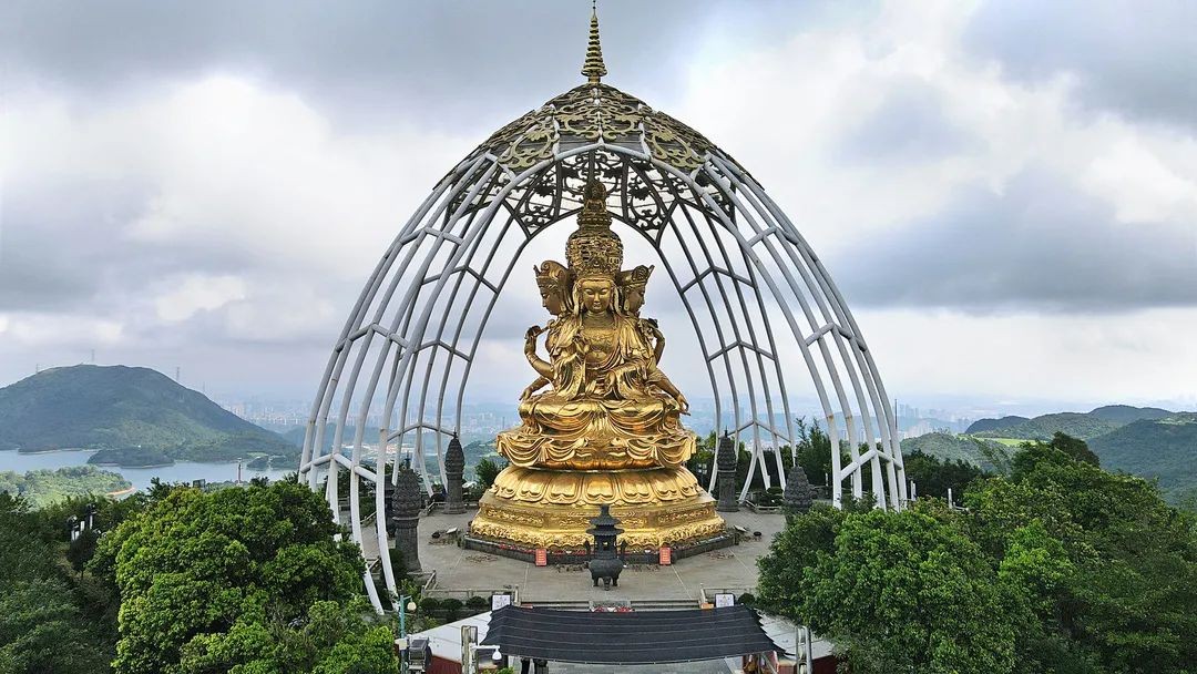大华兴寺位于深圳东部华侨城內,坐落在大俠谷、茶溪谷、云海谷之間的观音坐莲山上,如同一座莲台被四面山水簇拥,像是高高的守护着世人,寺庙占地面积1.2万平方米。