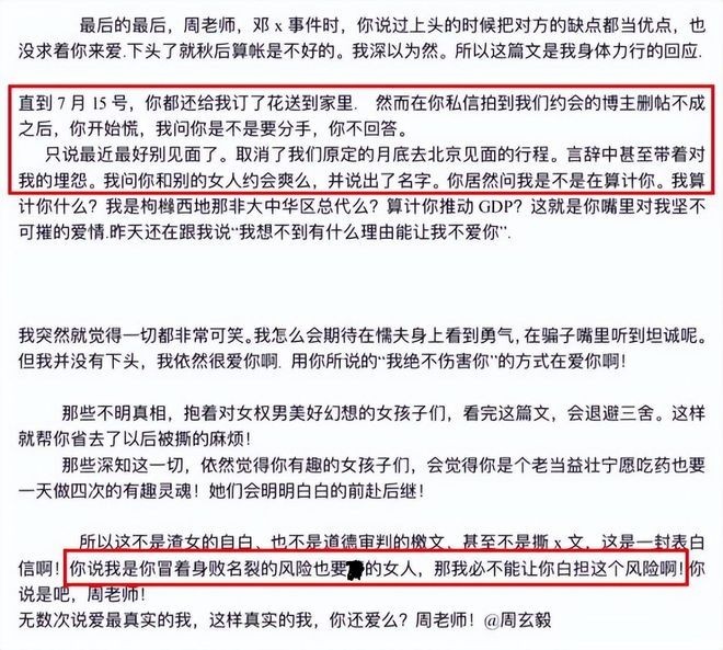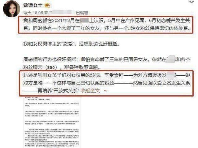 一位叫“致谭女士”的女网红,在社交平台上发了一篇小作文,说是小作文,反复细读起来,完全就是周玄毅的“罪名状”。这位女网红字里行间叙述了她与周玄毅的相知相恋,若只是正常男女谈恋爱,那周玄毅也不至于被人人喊打,重要的是,“致谭女士”爆出了周玄毅真正的渣男面目。