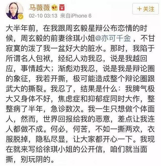 马薇薇发了一篇长文章在微博上为自己发声,她认为忍无可忍无需再忍,于是在微博上和徐琪硬刚了起来。好长一篇文章,话里话外都在说当时和周玄毅公布恋情的时候,被徐琪泼了脏水,她心理受到了很大的伤害,整个人的状态都不好了,病了大半年,现在不想忍了,让徐琪把话都说清楚。