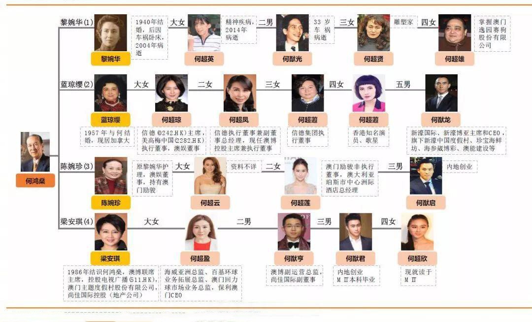 就拿赌王的二房蓝琼缨这一脉来说:何超琼当年嫁给了中建的许晋亨,何超凤嫁给了大马主何寿康的儿子何志坚,何猷龙则娶了维他奶家族的罗秀茵。