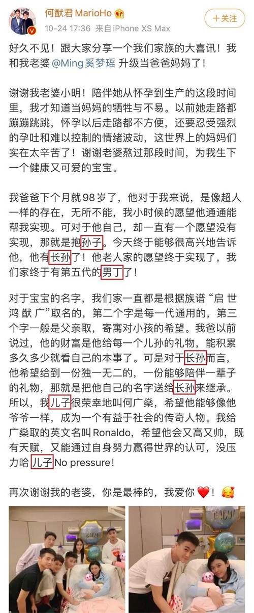 在奚梦瑶生下何家的长孙后,何猷君兴奋地发文表示: