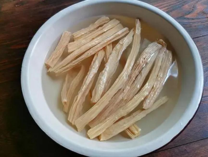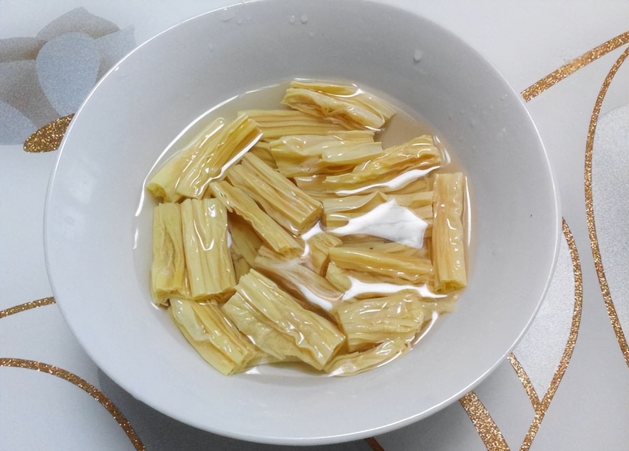 腐竹需要浸泡后才能进行烹饪,在浸泡过程,也可以仔细观察经过水泡后的腐竹状态。