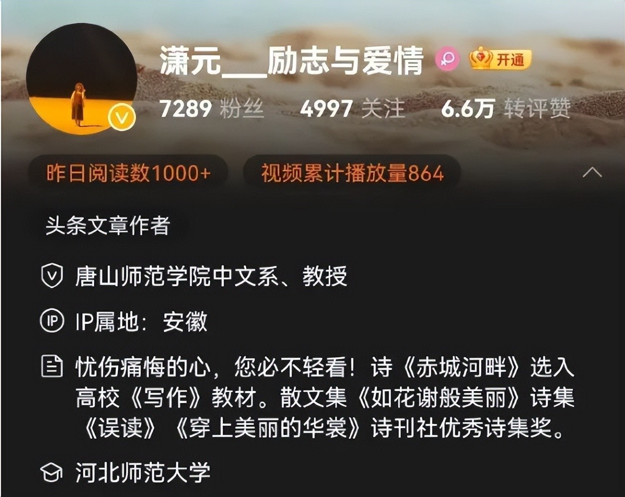 从下图的微博账号可以看出,“潇元___励志与爱情”认证为“唐山师范学院中文系教授”。据网上公开信息、资料显示,此女教授真实名为石文瑛,女,潇元是其笔名,1962年生,祖籍河北沧州肃宁,唐山师范学院教授。毕业于河北师范大学中文系。