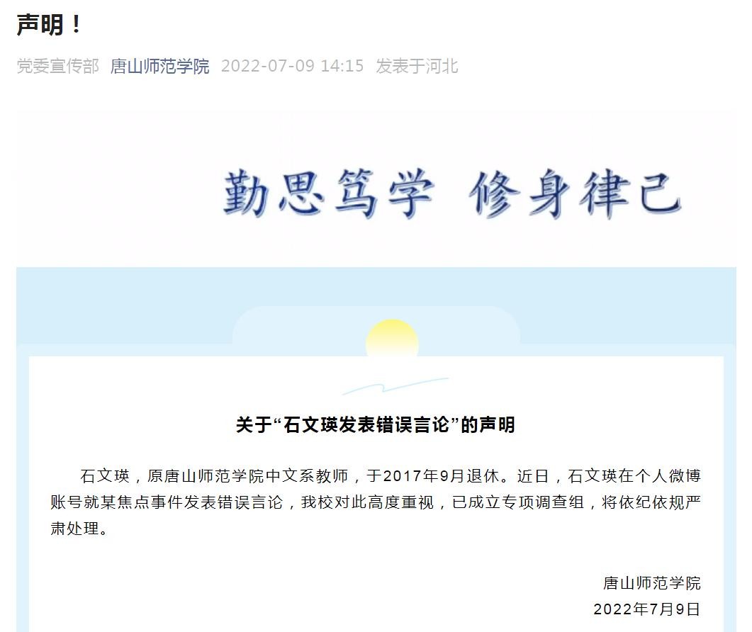 就在今天(7月9日),7月9日,唐山师范学院发布关于“石文瑛发表错误言论”的声明。其原文如下: