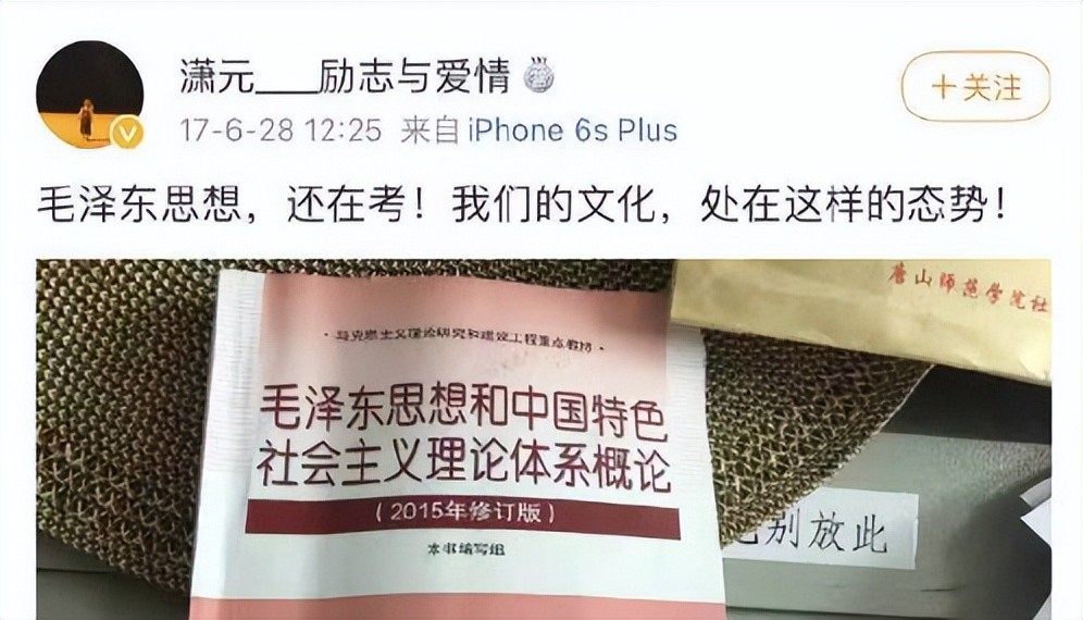 可怕的是,这个女教授还曾在其个人微博表达对中国传统、中国文化的不满和讽刺。如下图所示,具体内容就不在此重复了。只想问问这位女“教授”,毛泽东思想过时吗?如果没有毛泽东思想,你哪来的今天的幸福生活??更重要的是,这家伙在互联网平台附上的图片是《毛泽东思想和中国特色社会主义理论体系概论》。