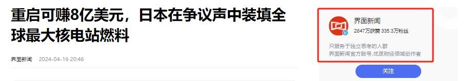 界面新闻:重启可赚8亿美元,日本在争议声中装填全球最大核电站燃料
