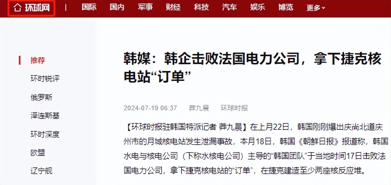 环球网:韩媒:韩企击败法国电力公司,拿下捷克核电站“订单”