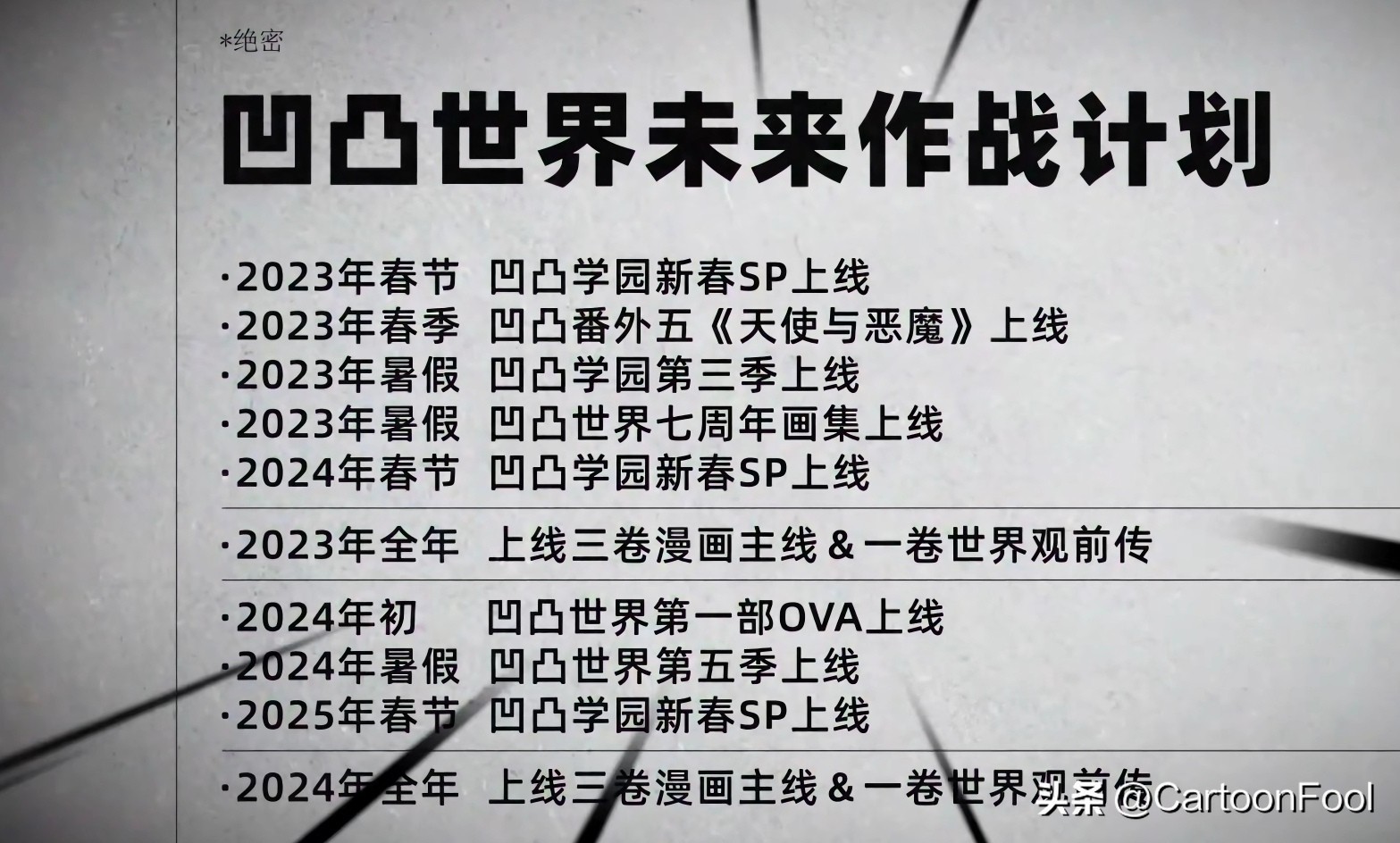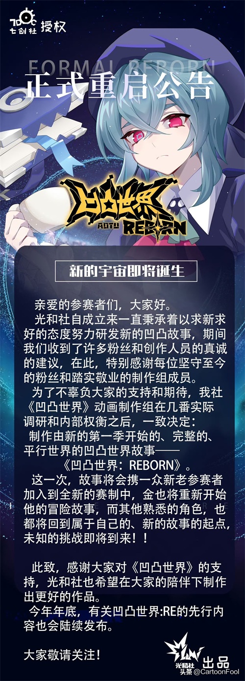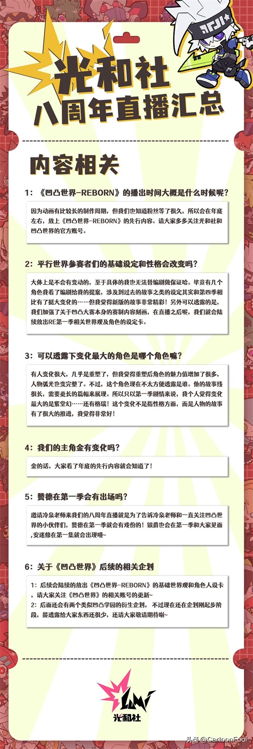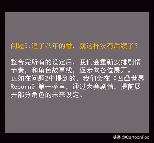 而且公告还提到了后续的内容规划,大概率就是这次的《凹凸世界-REBORN》了,重点是在6月29日的补充说明中“问题5:追了八年的番,就这样没有后续了?”的回答没有一点提到《凹凸世界》动画第五季了。