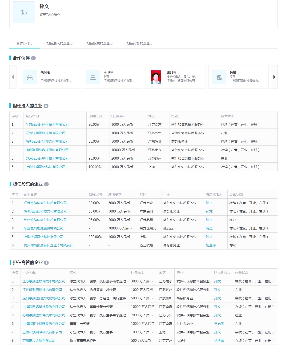 孙文担任法人的企业有:江苏维纳达软件技术有限公司、江苏沃购网络技术有限公司、深圳维纳达科技文化有限公司、中海联网络科技股份有限公司、苏州维纳达软件技术有限公司、上海沃娱网络科技有限公司;孙文担任股东的企业:江苏维纳达软件技术有限公司、深圳维纳达科技文化有限公司、苏州维纳达软件技术有限公司、梦兰星河能源股份有限公司、上海沃娱网络科技有限公司、杭州唯尚投资合伙企业(有限合伙);孙文担任高管的企业:江苏维纳达软件技术有限公司、江苏沃购网络技术有限公司、深圳维纳达科技文化有限公司、中海联网络科技股份有限公司、苏州维纳达软件技术有限公司、中海联商业保理股份有限公司、上海沃娱网络科技有限公司、苏州塞迈金属有限公司。