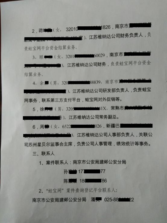 众多投资者在资金无法提现后选择了报警,倪先生向和讯315讲述,在2018年1月6日孙文已被逮捕,截止目前警方已逮捕涉案人员4人。通过投诉者向和讯315提供的一份"蛙宝网"涉嫌非法集资案件简要案情可知,截至目前未兑付本金的投资人有12213人,涉及金额约25.85亿元。但至今警方除了告知报案人目前已逮捕4人,因案件复杂已向省检察院申请延期之外便没有其他任何消息。和讯315致电南京市公安局建邺公安分局,了解案件进展情况。和讯315打通孙警官的电话后表示要了解一下蛙宝网的案件进展情况,孙警官表示按照规定他不方便向我们透露案情,需我们向进行媒体对接的警官去了解,和讯315问询对接警官联系方式孙警官表示他不清楚。
