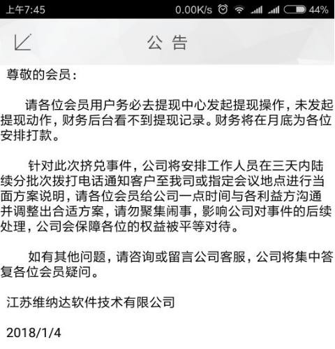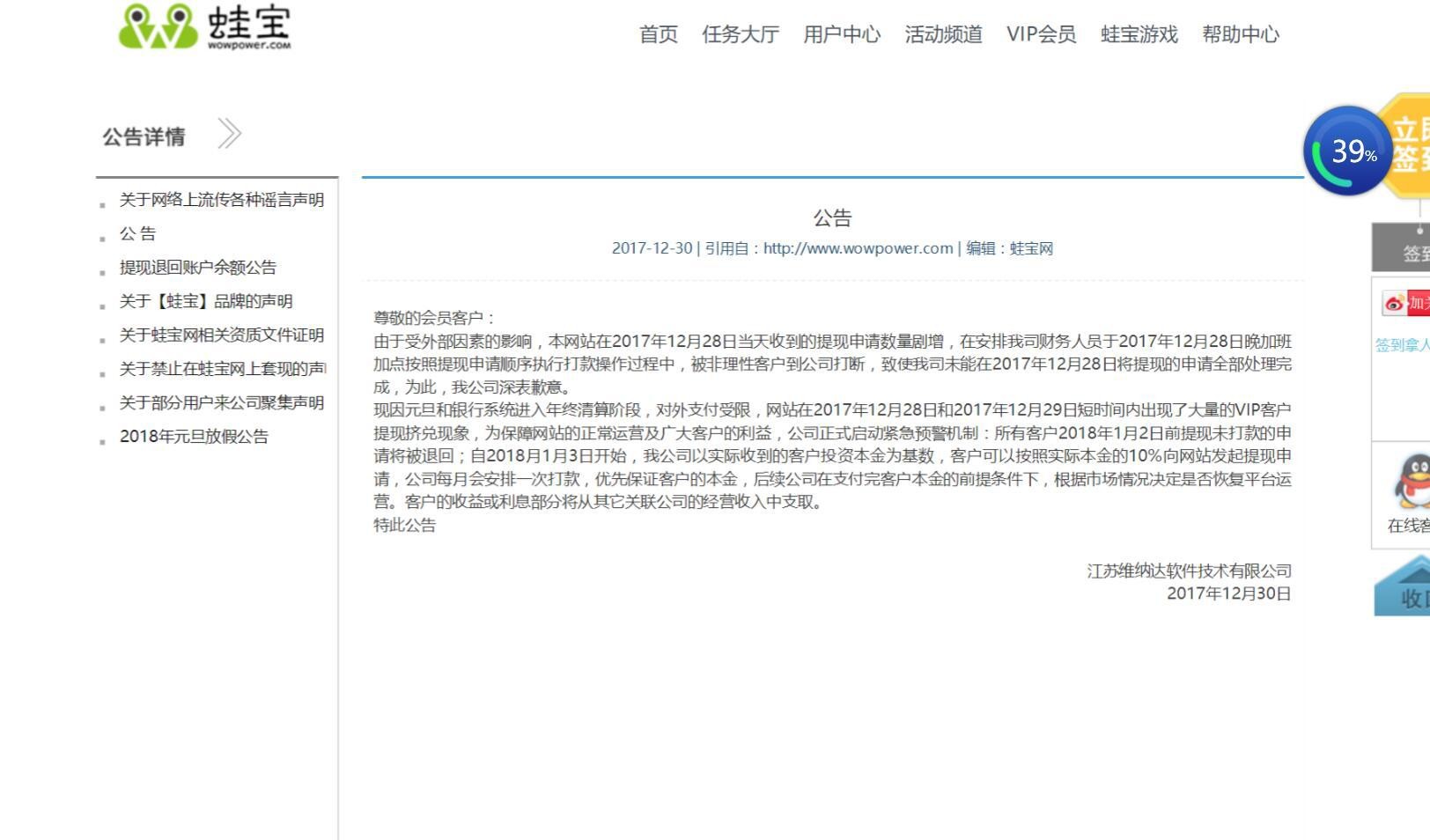 在2017年12月27日,蛙宝网关闭了提现通道,并发表公告称,因非理性客户到公司打断致使提现申请未能全部完成,并承诺在2018年1月3日开始,分10个月以每月10%返还投资者本金。退完本金,收益或利息从其他关联公司的营收中支付。当众多投资者等待第一笔打款到账的时候,蛙宝网又发布了新的公告,公告称将在1月底安排打款。在2018年1月6日,蛙宝网的网站无法打开、APP无法登陆、服务器离线。倪先生向和讯315讲述,截至目前他并没有收到任何返款,蛙宝网至今没有任何人员出面来解决投资者的问题。