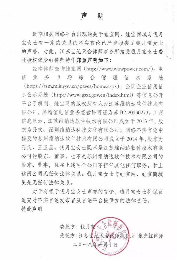 投诉者向和讯315提供了一个,视频中疑似孙文的太太罗某在公安局与人交谈时提到,江苏梦兰集团欠了蛙宝网几千万。因江苏梦兰集团法人钱某与孙文有相关联公司且为合作伙伴关系,所以多名投资受害者前往江苏梦兰集团问询情况。投资人江先生投诉信中提到,在投资人到达江苏梦兰集团时,已有大批安保人员在驻守,并驱赶投资人。与此同时钱某便发布了律师声明,声明其与蛙宝网、蛙宝商城两个公司无任何关系。