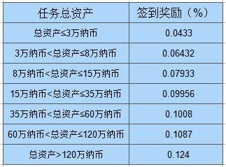 根据蛙宝网的官网信息可知,投资者可通过充值资金后领取任务和签到获得收益,1元等于1纳币,充值越多收益越高。投资者可通过缴纳押金1000纳币、10000纳币、100000纳币领取游戏任务在30天之后便可分别获得收益17纳币、170纳币、1700纳币,也就是说缴纳10000元押金一个月后便可收益170元。而通过签到获得的收益从下面图表中可知,10000元总资产的签到收益奖励为0.0433%,一天签到收益为10000*0.0433%=4.33元,30天就是129.9元,这其中不包含签到时随机发放的浮动收益。通过计算,投资1万元一个月的收益最少也会超过300元,综合年化高达36%,如此高额的收益吸引了众多投资者。当然收益也不是这么容易就拿到手的,投诉者向和讯315反映,在领取任务的周期内,投资者所缴纳的押金将被冻结不能提现。