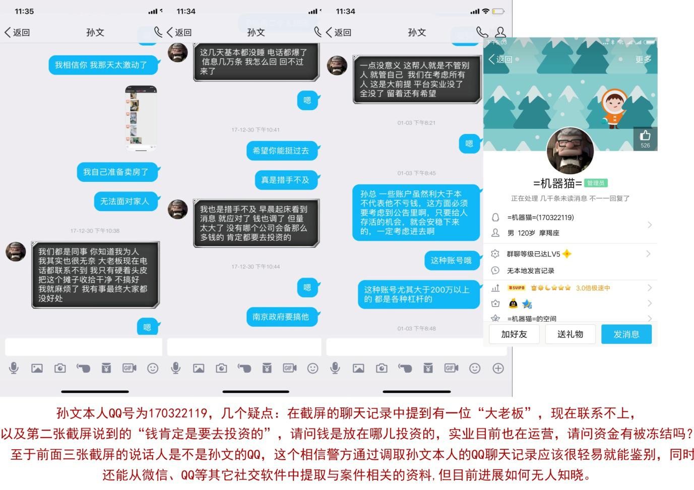 投诉者向和讯315反映,在受害者的维权群里流传着关于孙文与人谈及背后大老板的QQ聊天截图。通过截图可知,蛙宝网法人孙文提到联系不到大老板,只能他自己硬着头皮将这个摊子收拾干净,不搞好他就麻烦了,还提到已将投资者的资金拿去投资了。通过天眼查可知,江苏维纳达软件技术有限公司的股东出资比例情况是,孙文占比30%,深圳维纳达科技文化有限公司占比70%,而深圳维纳达科技文化有限公司孙文出资比例为55%。由此可知,孙文应为江苏维纳达软件技术有限公司实际控股人,但聊天截图中却提及需要联系的"大老板"究竟是谁呢?