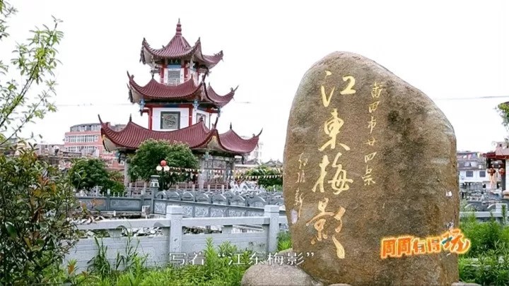 走进木兰溪畔1300多年的古村落江东村,只见村口立着一块大青石,写着“江东梅影”。石头后面是一片水塘,当地人称“南塘”。南塘上面有一座为纪念梅妃而建的“梅亭”,亭台楼阁飞檐翘角,远远望去气势恢宏。