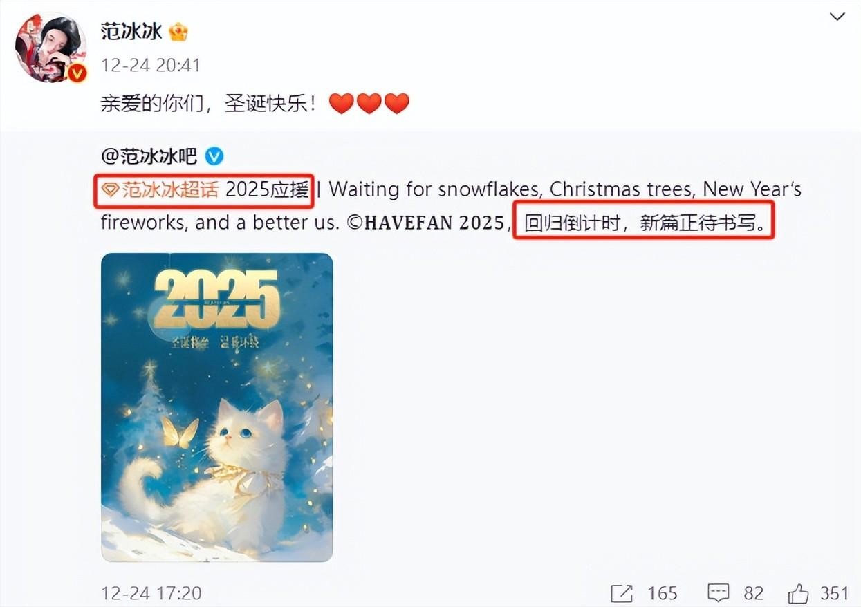 12月24日,范冰冰在微博上发文,向粉丝们送上了圣诞节的祝福,而她转发的内容中,“回归倒计时”的字眼更是让人浮想联翩。