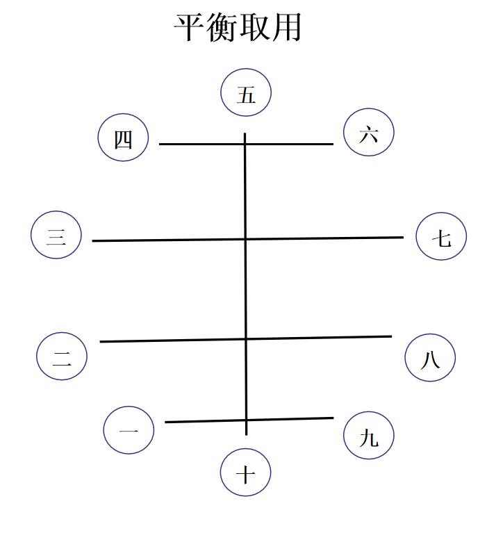 第一步:“平衡取用”。讲合一图中,处于上下位置的五和十以外的数字用平行线连起来。根据这个规则,是偶数与偶数相连,奇数与奇数相连。