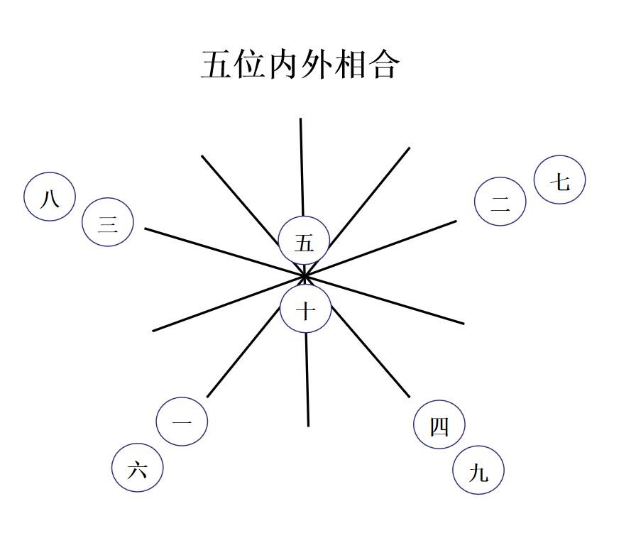 第二步:“五位内外相合”,五和十移向中心位置。其余数字,对角线相连的两个数,奇数为阳,偶数为阴,偶数走向奇数。一,二,三,四为生数,六,七,八,九为成数。生数居内,成数居外。