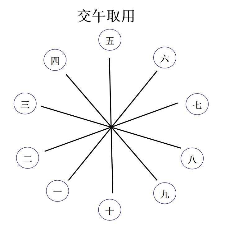 第一步:“交午取用”,即画出十个数字圆图的五组对角线。