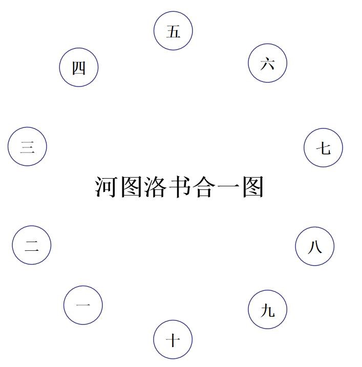 河图洛书之名最早可见于先秦文献《尚书.顾命》“大玉,夷玉,天球,河图,在东序”,《论语.子罕》“凤鸟不至,河不出图,吾已矣夫”。在明朝朱升(就是为朱元璋提出“高筑墙,广积粮,缓称王”的那位谋士)在其《周易旁注前图》中,展示了《河图洛书合一图》,认为河图洛书就是由此图变化而来。《河图洛书合一图》如下:
