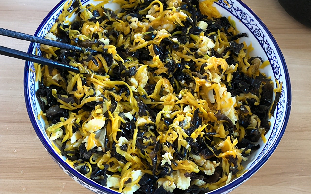 第四步:在装有南瓜的碗中倒入黑木耳和鸡蛋碎,再加入盐、蚝油、香油、鸡精、五香粉调味,最后加入熬好的葱油,拌匀后备用。
