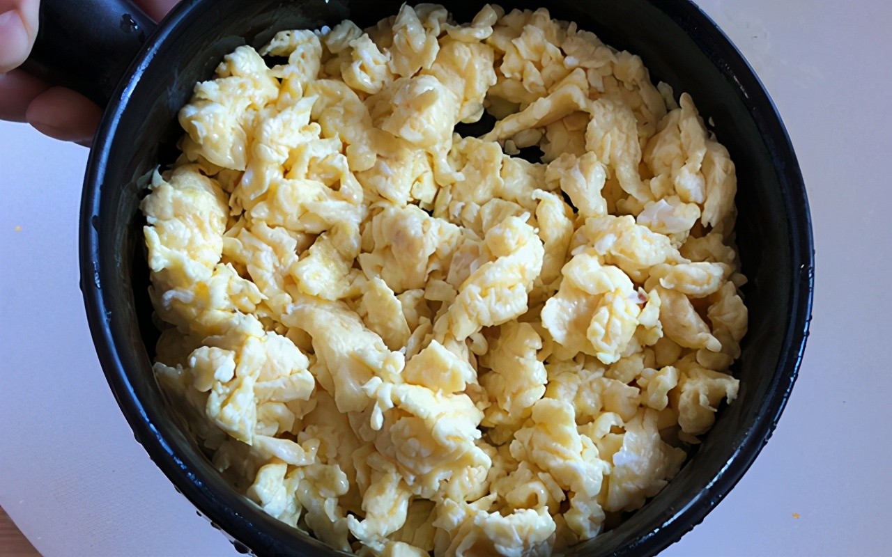 第二步:碗里打四个土鸡蛋,加入适量盐,充分搅散。锅中加油,倒入鸡蛋液,炒成鸡蛋碎,放入碗中晾凉备用。