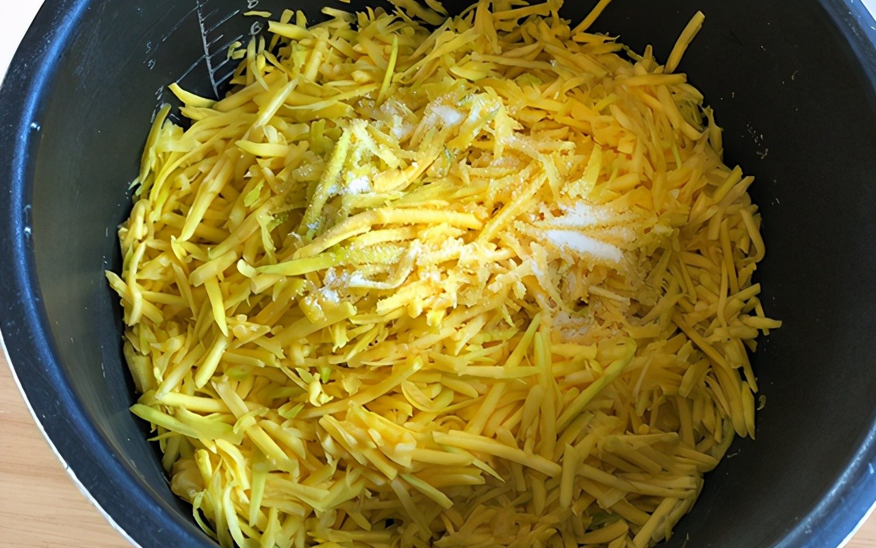 第一步:南瓜去皮去瓤并清洗干净,然后用刨丝刀刨成丝放入大盆中。加入适量盐,腌制出南瓜中的水分后,挤干备用;木耳洗净后切成丝放入碗中备用。