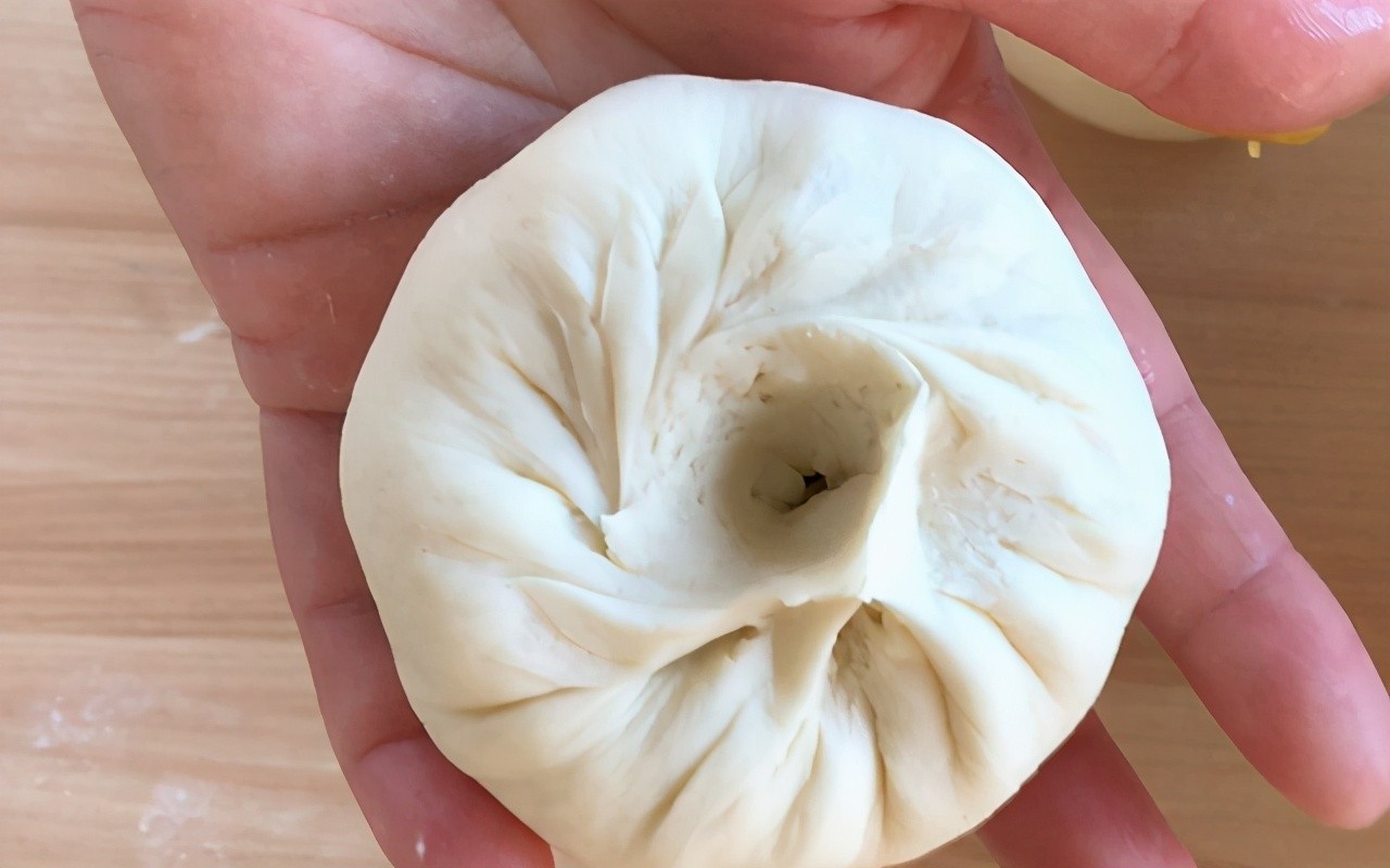 第五步:面团休息好后充分揉匀,然后搓成条,揪剂子(每个剂子约58克)。把剂子按扁并擀成边缘薄中间厚的皮子,放入调好的馅儿,捏褶子包成包子。