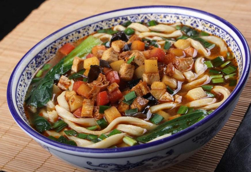 八、臊子面: 臊子面是西安的地方面食之一,以其浓厚的肉香和辣味而著称。制作时,选用细面条煮熟,配以炒制的臊子(猪肉末加入豆瓣酱等调味料炒制而成),再淋上热气腾腾的汤汁。臊子面以其浓郁的肉香和辛辣的口感,深受西安人民喜爱。