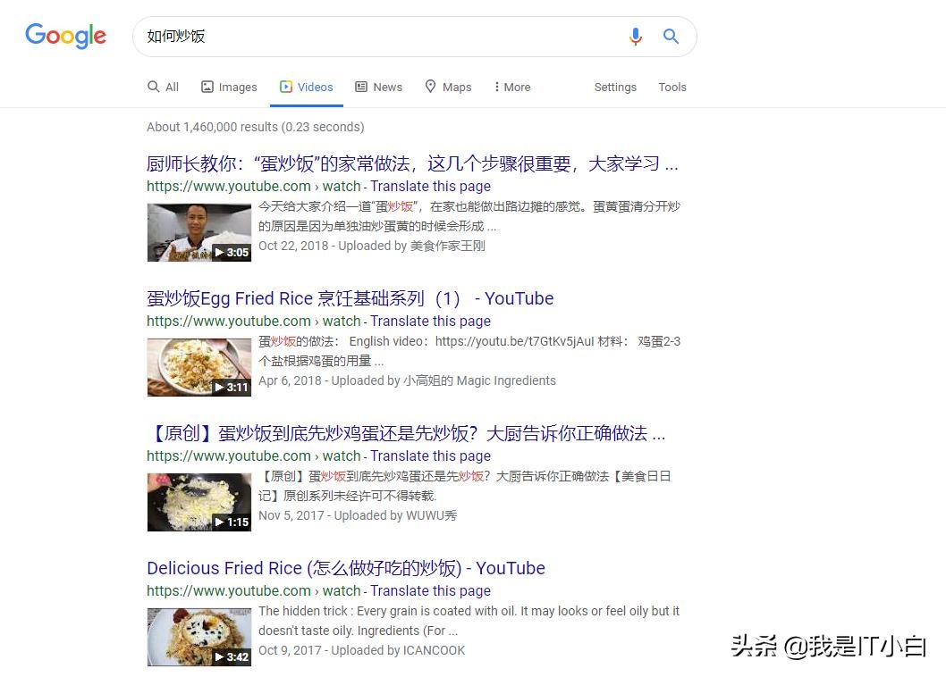 Google收录的视频网站数量庞大,就算你搜索“如何炒饭”都可以发现很多的教学视频。