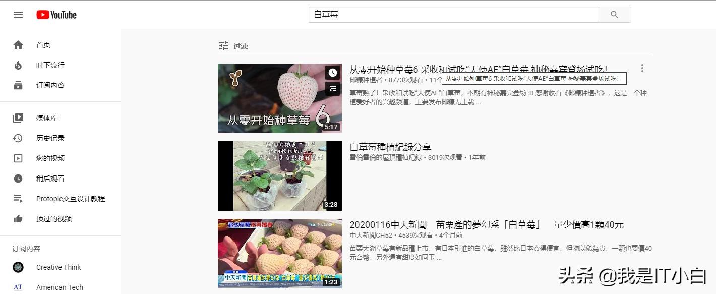 无论你搜索什么奇怪的关键词,youtube都能帮你找到相关的视频。比如我搜索了“白草莓”,因为最近我都在吃,味道还不错哦。
