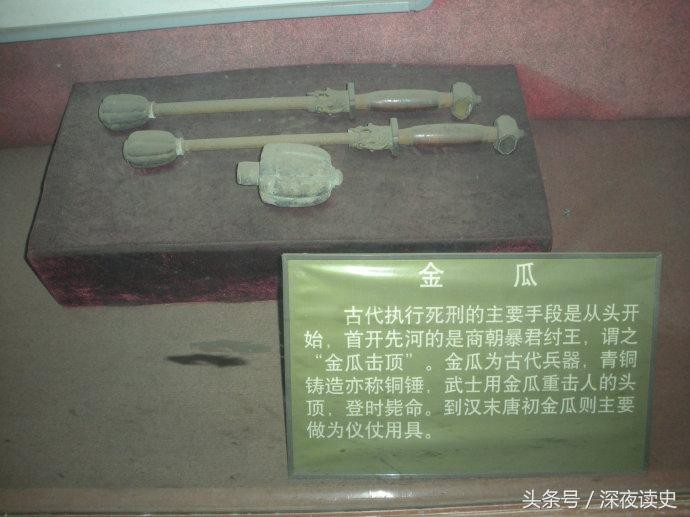 这种刑具传说是商纣王创造的,叫做“金瓜击顶”,重击之下,犯人登时毙命。
