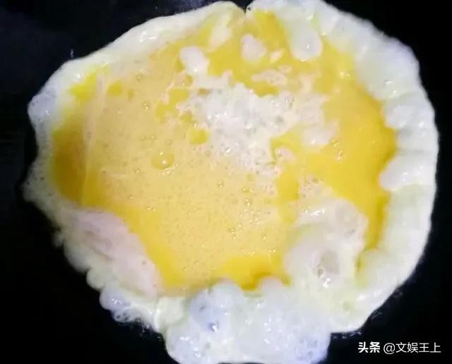 第二步:起锅烧油,油热倒入鸡蛋液,煎至稍稍凝固,用铲子迅速滑散,炒至七八分熟就可以出锅了。