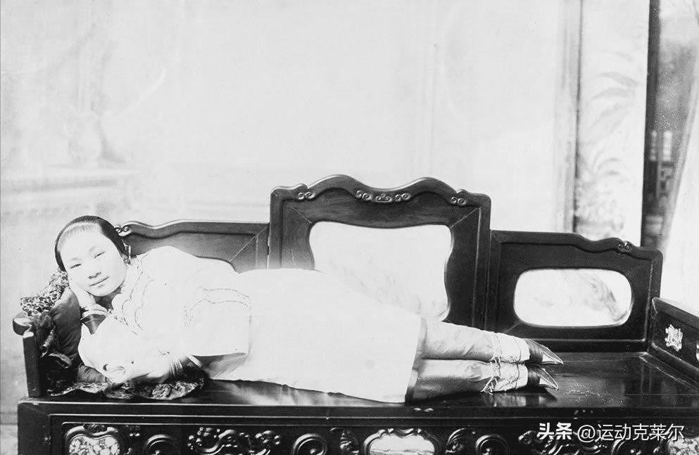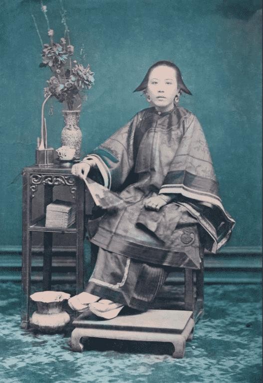 这是一位大家闺秀,她穿着得体,脚上穿着花盆底的鞋,这种没有裹脚的女子在当时很罕见。