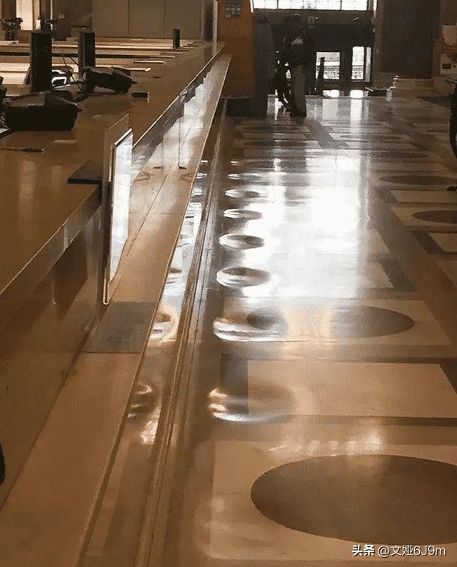 在一家开业多年的银行柜台前,地面已经被办理业务的人们踩出了一个个的凹坑
